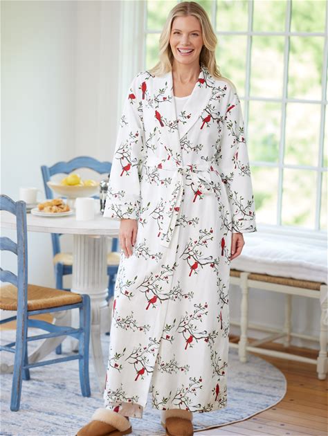 Women's Portuguese Cotton Flannel Wrap Robe - White Snow Cardinal - Medium - The Vermont Country Store